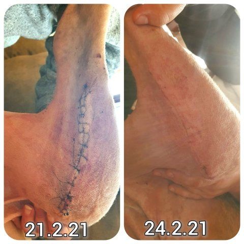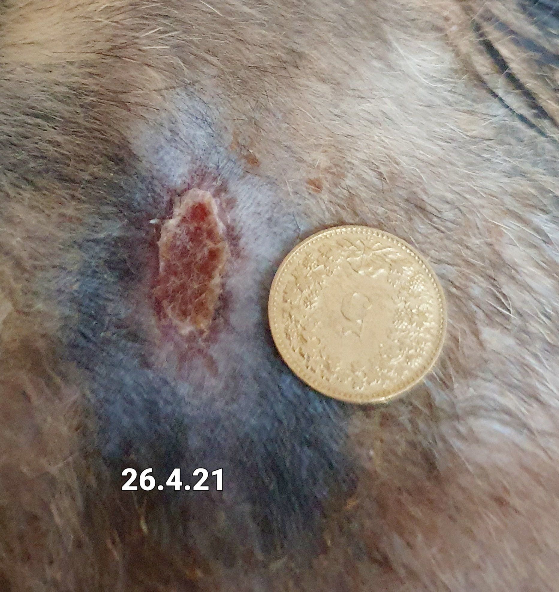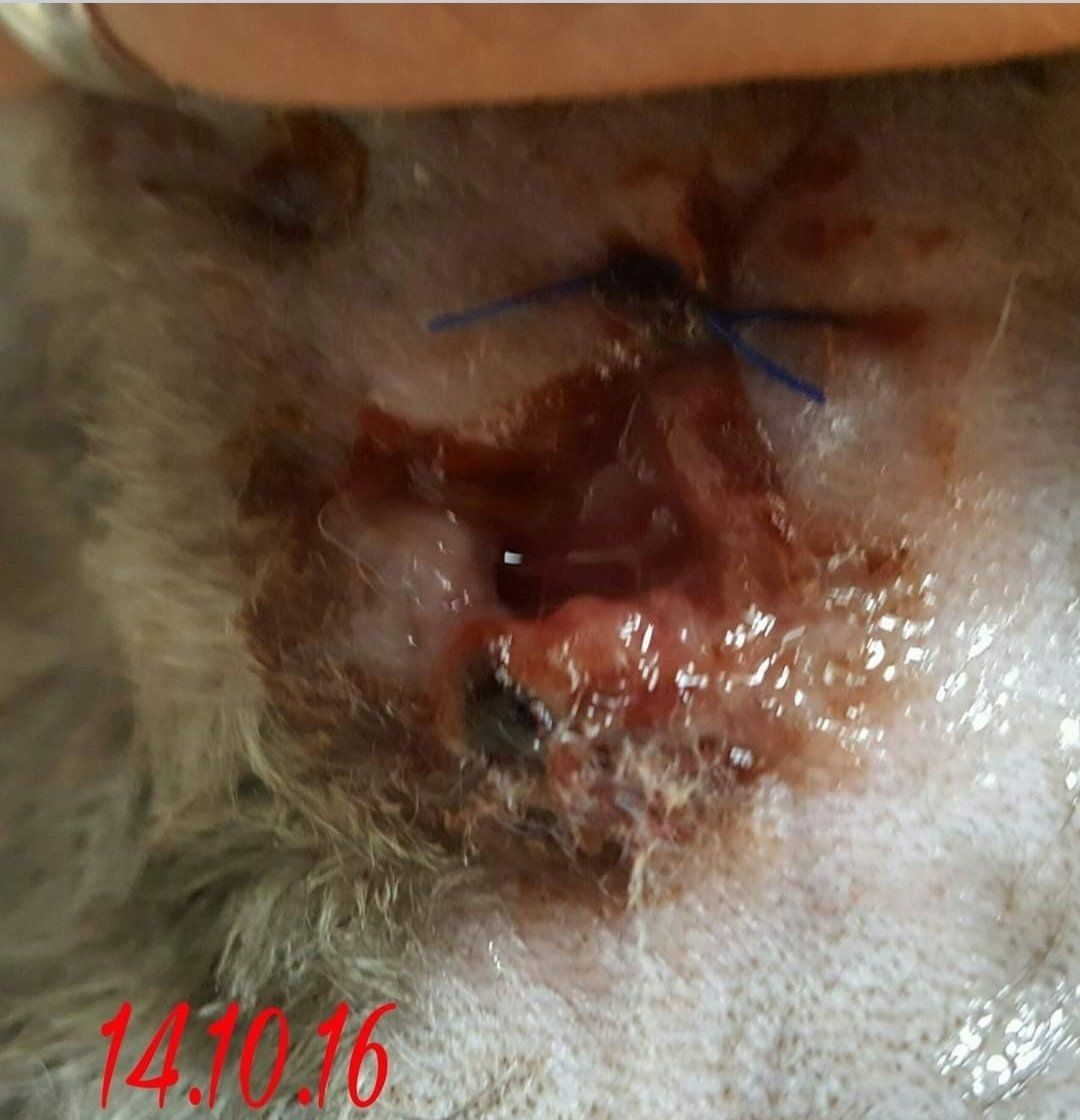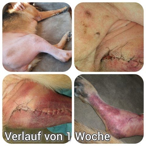 Hundebiss in die linke Flanke, Status nach Abszessbildung und Wund Debridement 6x4x2 cm grosses Loch
