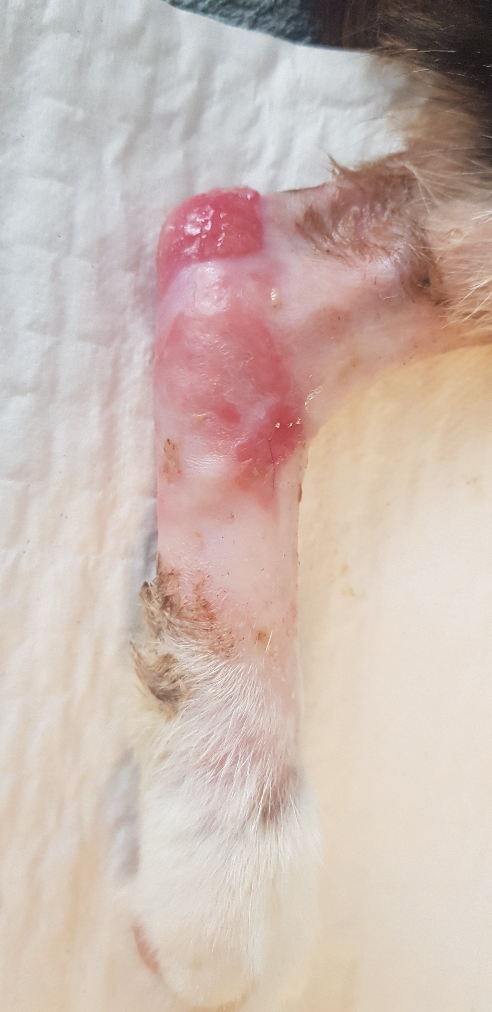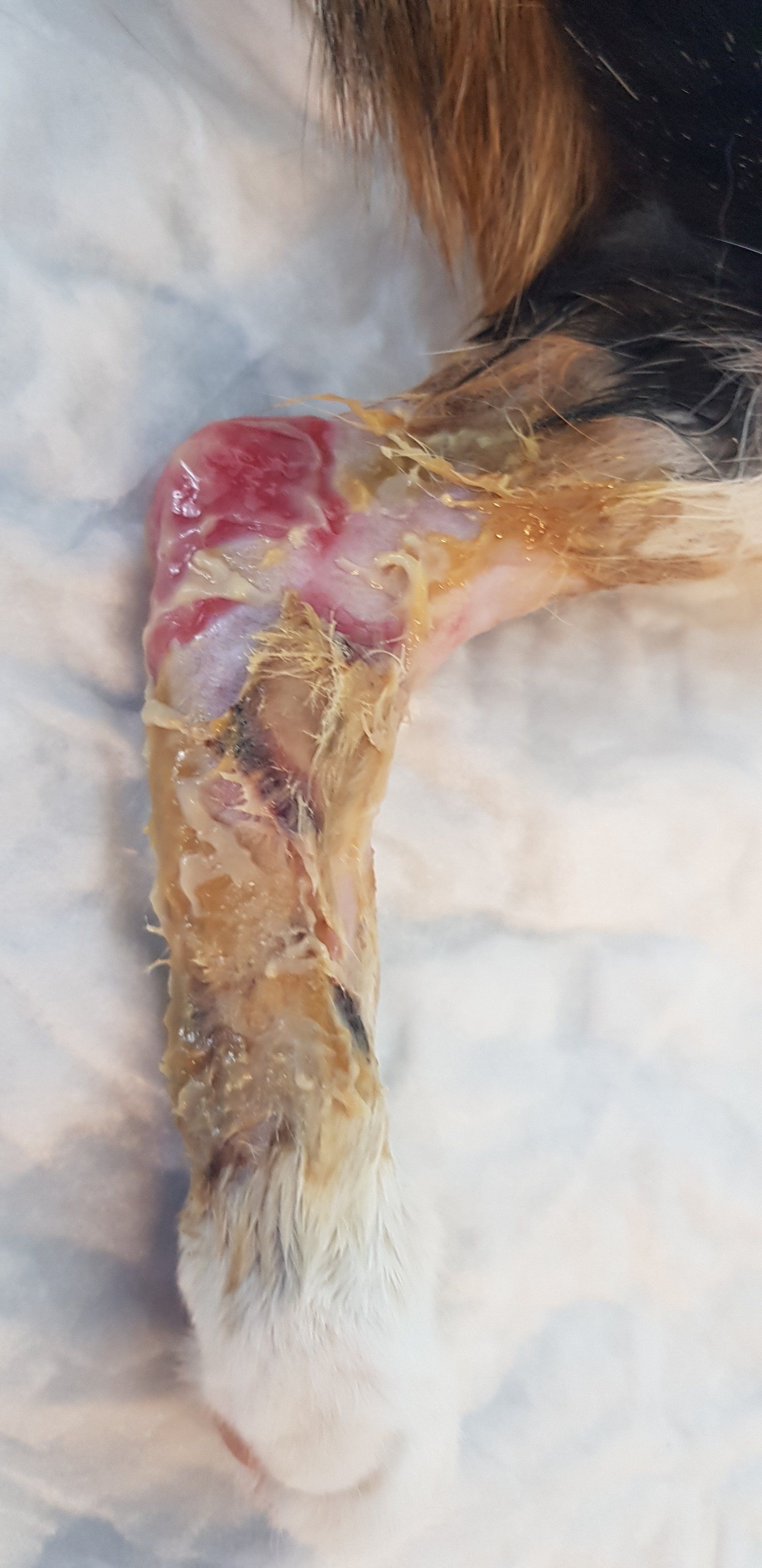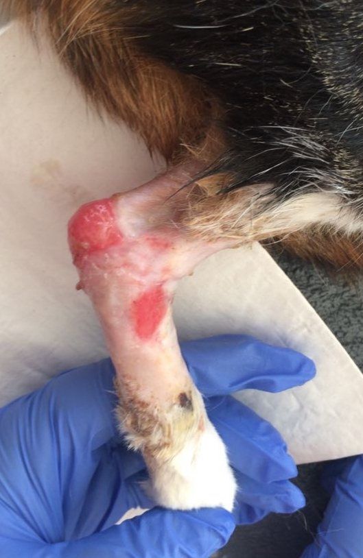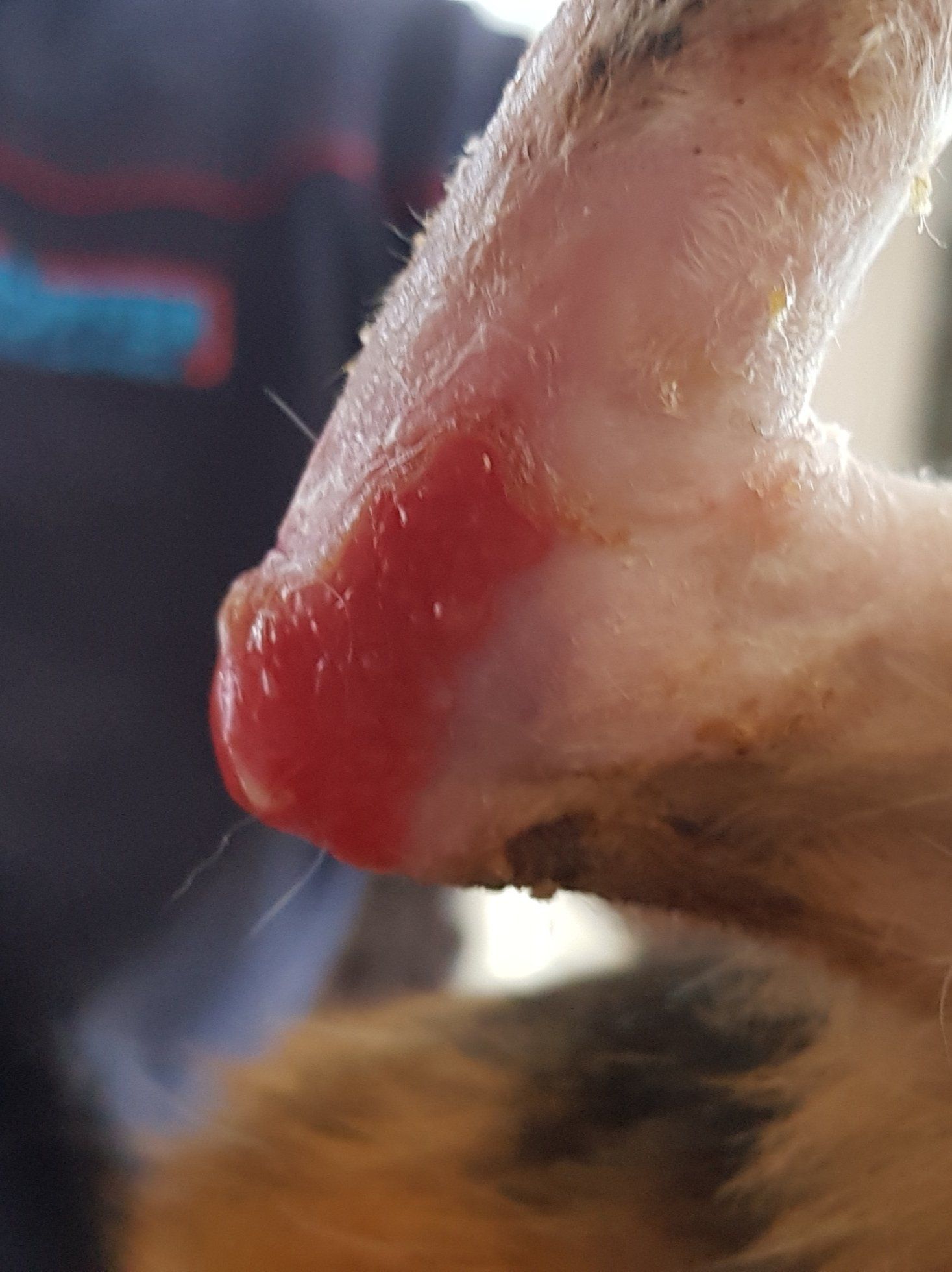 Hundebiss in die linke Flanke, Status nach Abszessbildung und Wund Debridement 6x4x2 cm grosses Loch